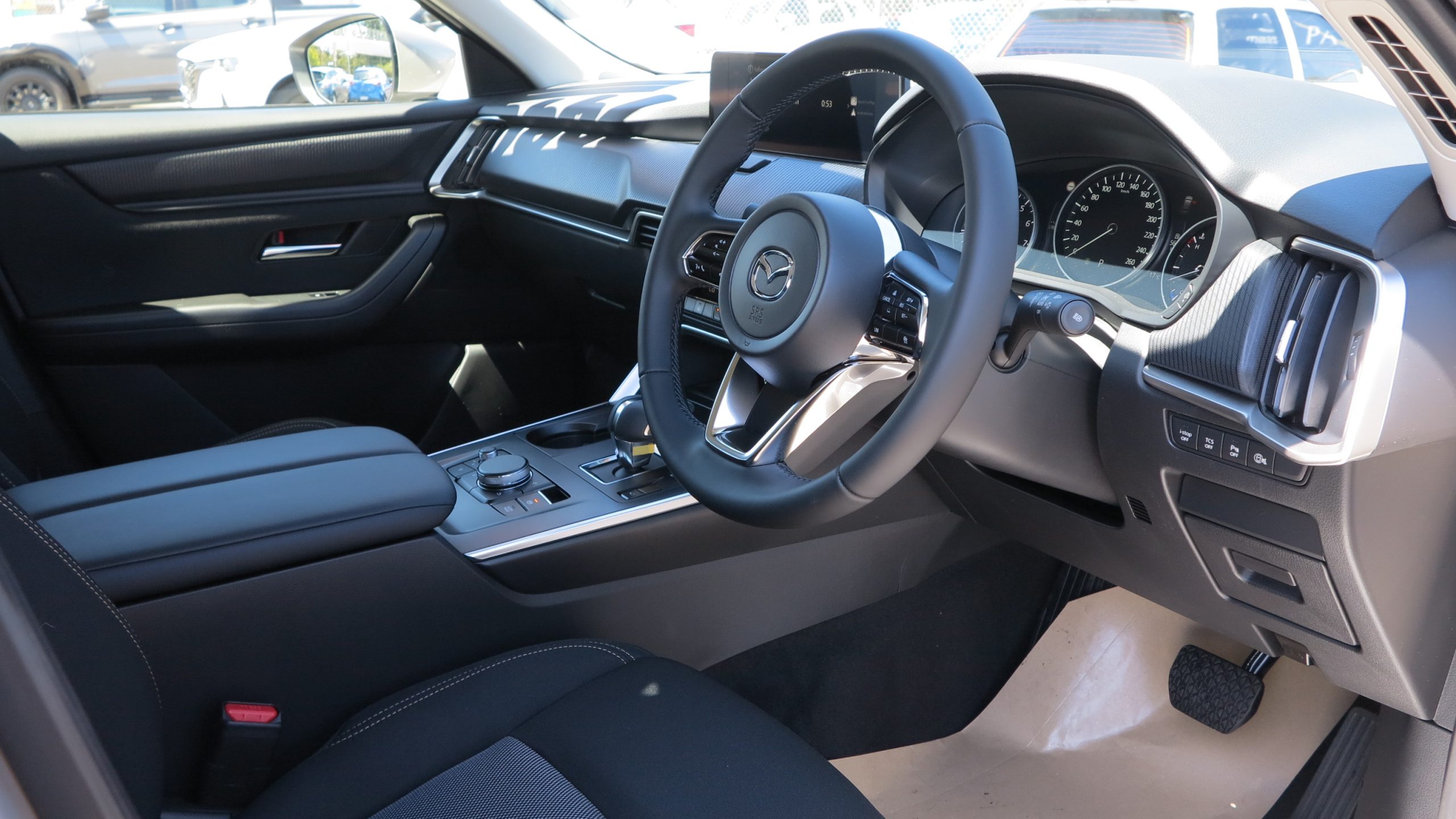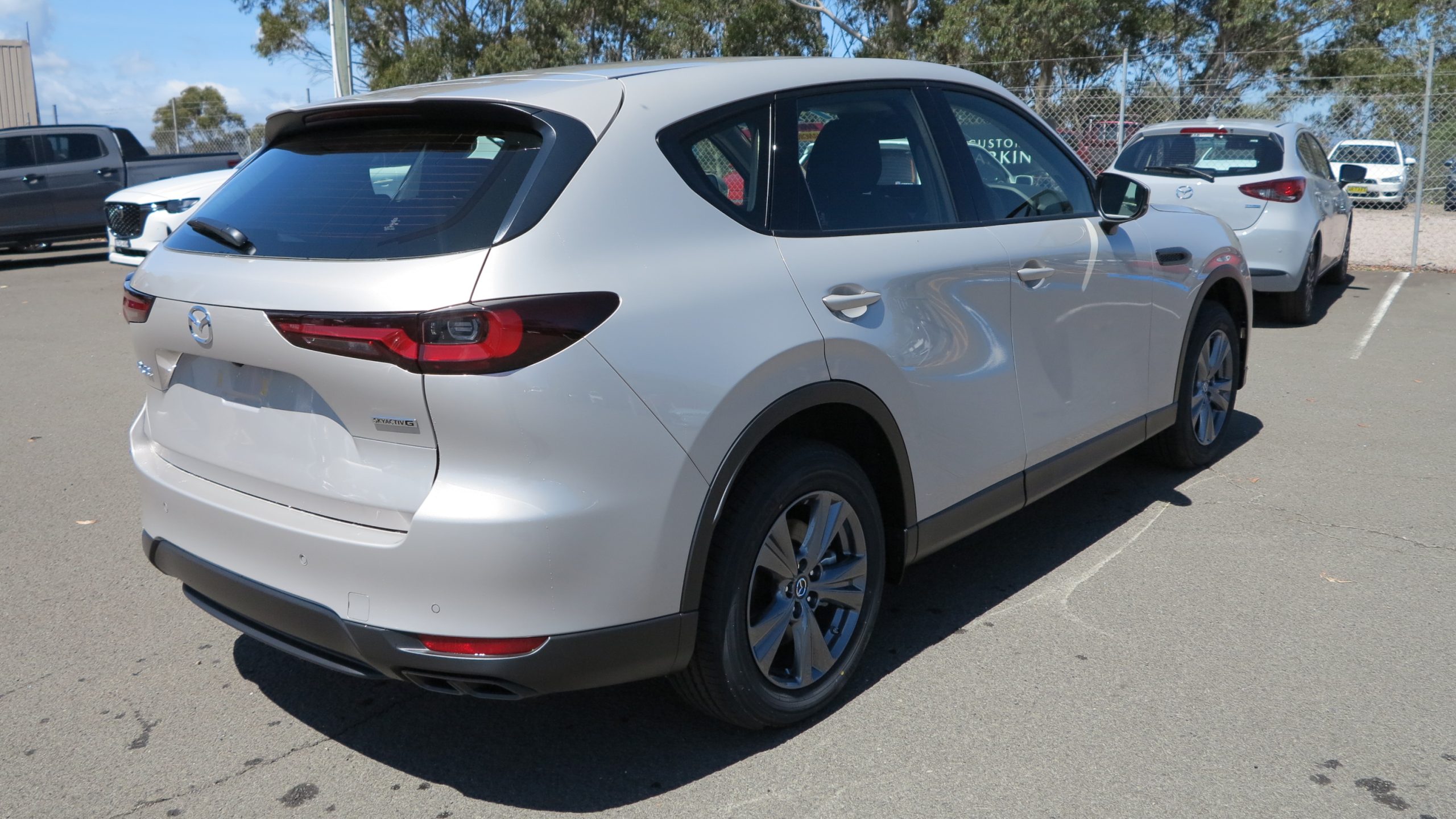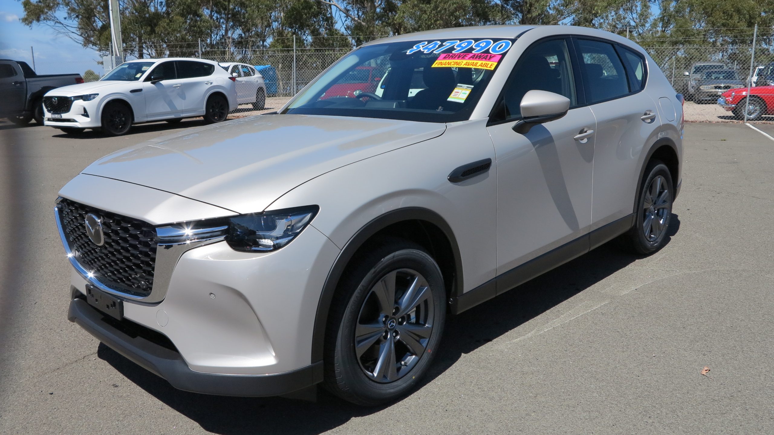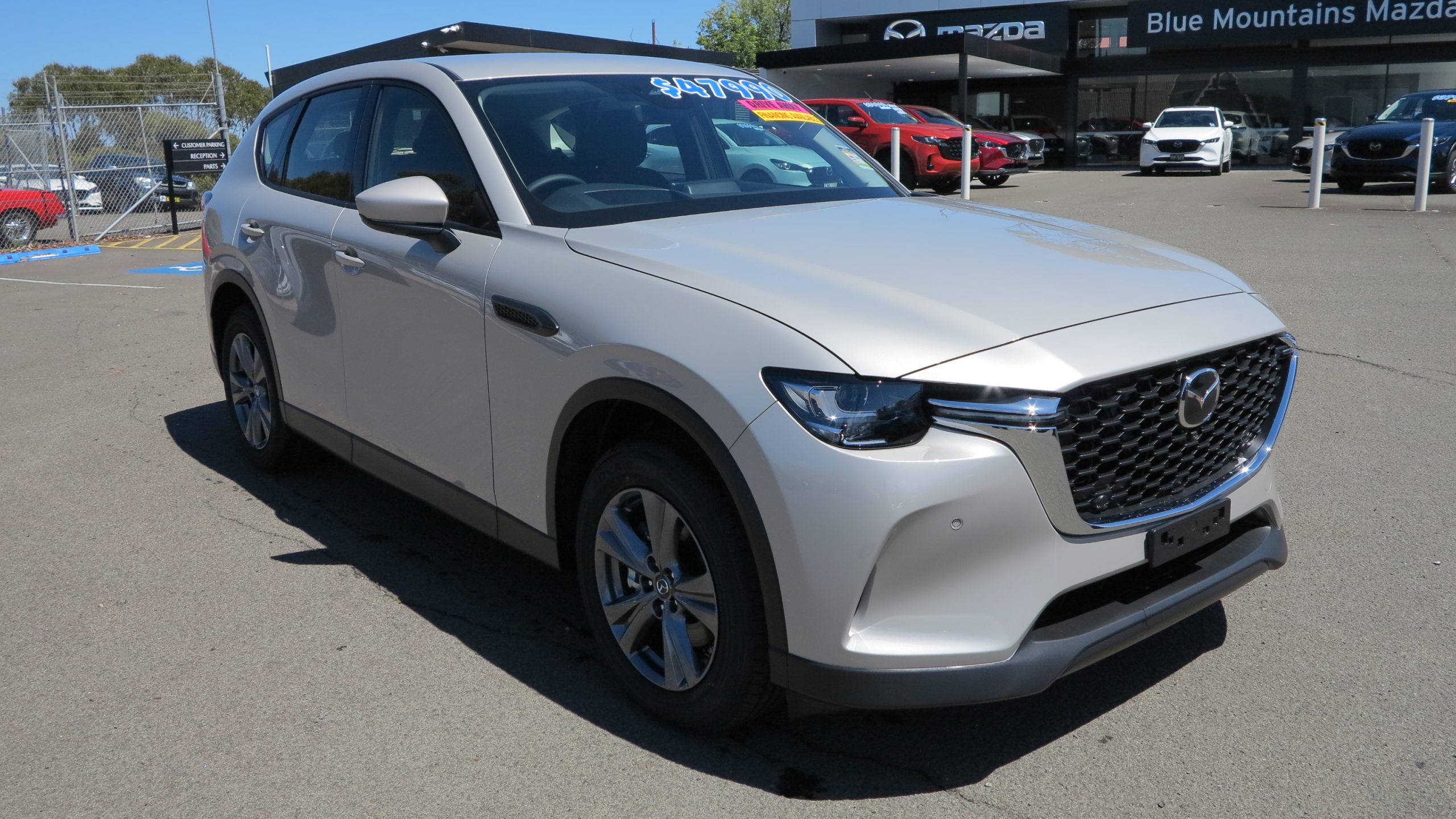 Brand new and on the lot ready for immediate delivery, Mazda CX-60 Pure in Platinum Quartz!